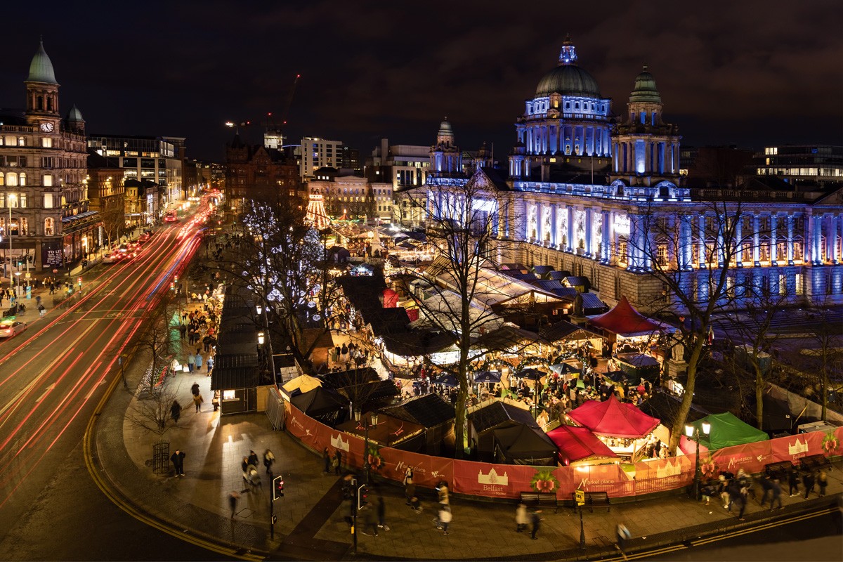 Weihnachtszauber erfüllt den Platz vor dem Belfast City Hall. © 2022 Brian Morrison