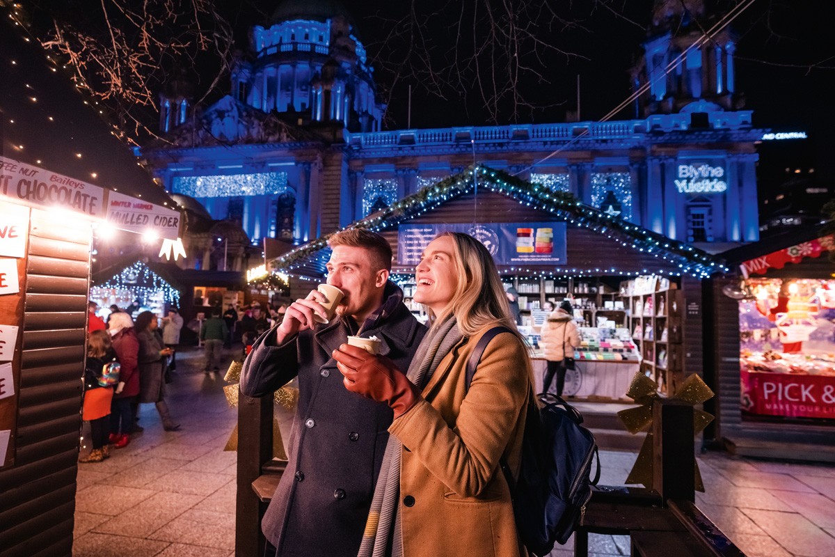 Auf den Lippen liegt natürlich auch «My Heart will go on», schliesslich wurde die Titanic in Belfast gebaut, dem historischen Unglücksschiff sind zig Attraktionen wie auch Ausstellungen gewidmet. Zurück zur ehrwürdigen City Hall, wo sich das glühende Herz der Weihnacht erhebt: Hübsche Holzhütten dicht an dicht, jede ein kleiner Kosmos aus Kostbarkeiten und Köstlichkeiten von katalanischen Süssigkeiten bis zu irischen Wollaccessoires. Über 100 internationale und lokale Händler beleben den hell erleuchteten Platz, sodass Gäste etwa italienische Schokolade zum Verschenken ergattern und in deutsche, gerade noch brutzelnde Bratwürste beissen oder spanische Paella gabeln und dazu im Takt der Live-Musik wippen, ehe die rotwangigen Kinder den Weihnachtsmann treffen oder den Markt vom Dach der historischen Karussellbahn von oben bestaunen. Ob sie sich später wohl noch dazu bewegen lassen, ein Familienfoto in der riesigen Schneekugel zu schiessen …?