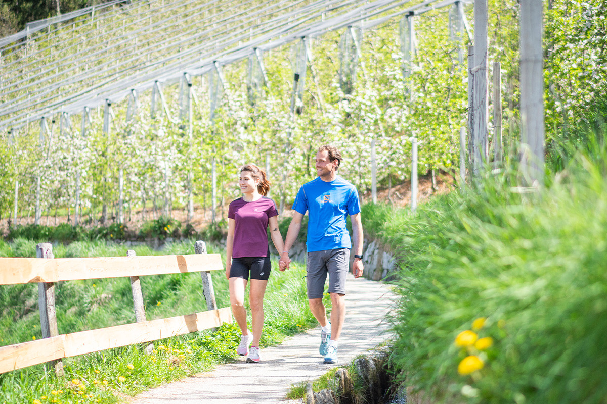 Derweil schlendern GeniesserInnen entspannt den historischen Waalwegen entlang. Diese Pfade verlaufen parallel zu traditionellen Bewässerungskanälen, welche die Bauern im Etschtal bereits vor Jahrhunderten angelegt haben. Heute noch führen sie durch eine Landschaft, die jetzt im Frühling mit jedem Schritt lebendiger wird: plätschernde Wasserläufe, Vogelgesang und der intensive Duft der Obstblüte begleiten Wandernde auf jedem Meter. Das gilt zum Beispiel für den Schenner Waalweg, der sich von der spektakulären Masulschlucht oberhalb des Dorfes durch Fichtenwald und Apfelhaine bis ins Naiftal erstreckt. Dabei erhalten Flaneure immer wieder freie Sicht auf den weiten Meraner Talkessel. Unterhalb von Schenna verläuft der Maiser Waalweg. Er ist am Ufer der Passer zu finden und bringt SpaziergängerInnen durch Wiesen bis ins Nachbardorf Saltaus.