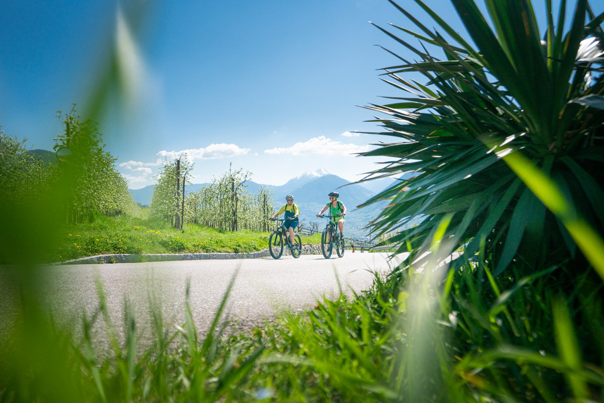Für alle, die das Gebiet lieber auf zwei Rädern erkunden, bietet Schenna ideale Bedingungen zum E-Biken. Mit sanfter elektrischer Unterstützung geht es durch Weinberge und über Almwege hin zu weiteren urigen Hütten, traditionellen Bauernhöfen und herrlichen Aussichts punkten. Unterwegs warten immer wieder kulinarische Höhepunkte. Das Angebot der GastgeberInnen unterwegs reicht dabei von hausgemachtem Apfelstrudel über typisches Südtiroler «Speckbrettl» bis hin zu regionalen Weinen, die direkt bei den ErzeugerInnen verkostet werden können. Und neue Energie tanken bei der Rast nicht nur die FahrerInnen, sondern auch die Akkus: E-Bike-Ladestationen gibt es etwa beim Berggasthof Videgg, beim Haashof oder beim «Hiaslbauer».