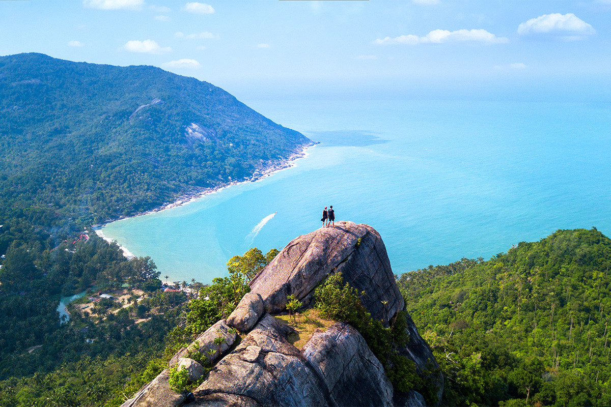 Wieder festeren Boden unter den Füssen, spaziert man entlang von malerischen, felsigen Buchten wie zum Beispiel Sairee, der längste Strand an der Ostküste oder Hat Chalok Ban Koa und Hat Sai Daeng im Süden. Wer Lust auf Aus- statt Weitblick bekommt, spurt auf den schmalen Pfad zwischen der Shark Bay und Chalok Ban Kao ein, der sich steil in felsige Höhen schlängelt. Mit jedem Meter wirken die grünen Hügel kleiner und die bräunlichen Schildkröten klitzeklein: Oben auf dem Aussichtspunkt John Suwan, benannt nach seinen beiden Entdeckern Mister John und Mister Suwan, ploppt pure Freude über das Panorama auf: wahrlich der Inbegriff von «Paradies». Wer sich in dieser windfrischen Wolkennähe wohlfühlt, kann dieser Wonne an weiteren Aussichtspunkten nachgehen, sei dies auf dem «Mango Viewpoint» in der nördlichen Inselmitte oder aber auf dem «Deisha Viewpoint» im Süden, wo das Auge an klaren Tagen bis nach Ko Phangan schweift.